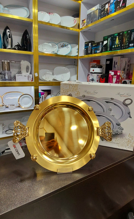 سینی گرد نگار طلایی دسته تاج ابعاد (۳۹×۳۹)